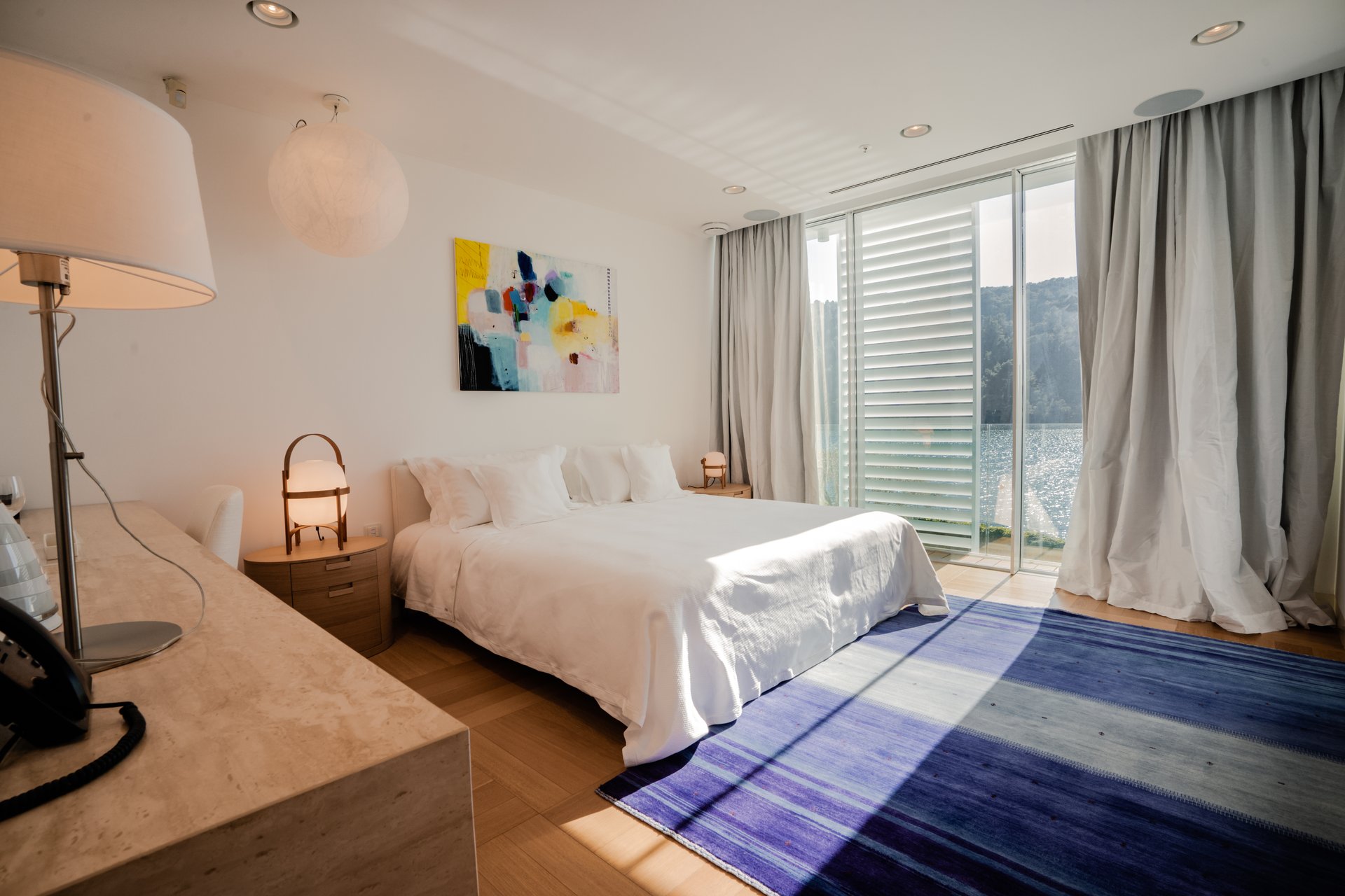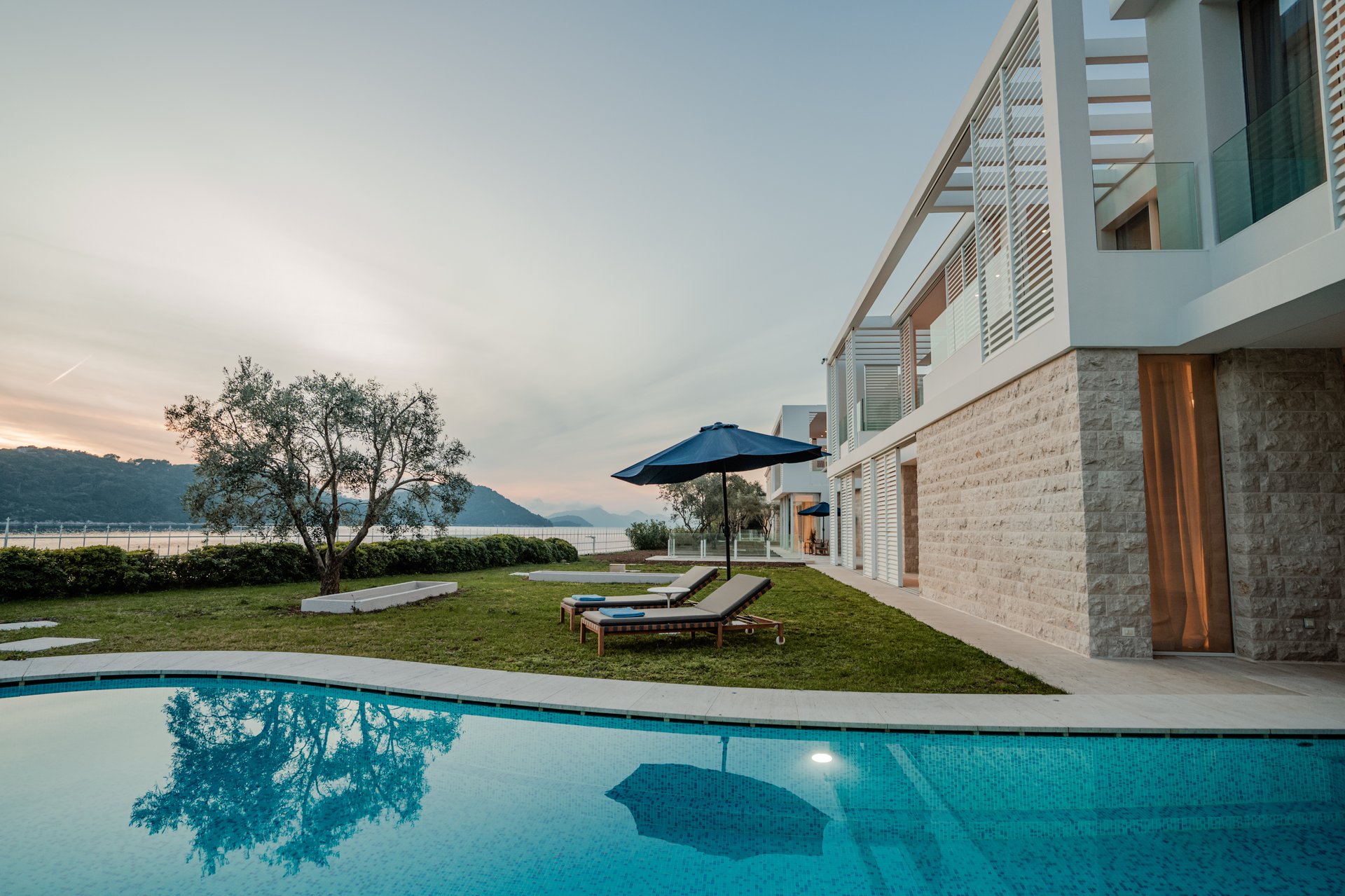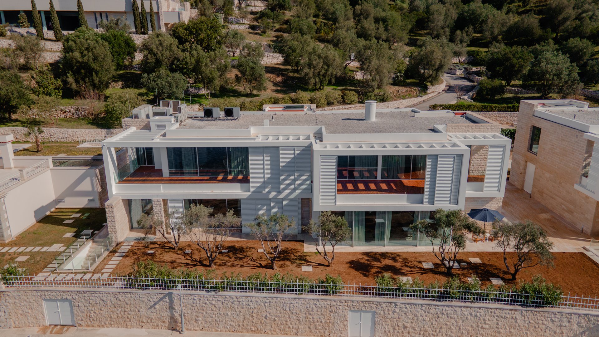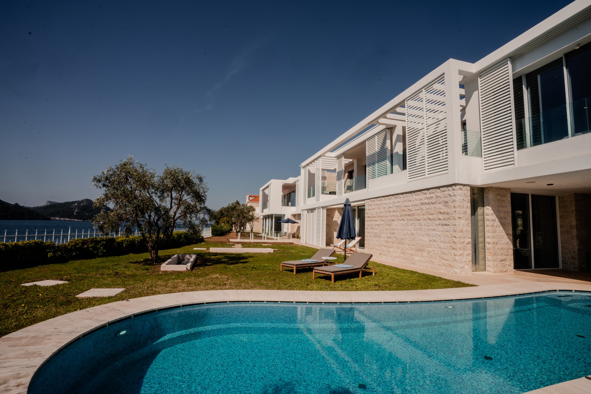 Each bedroom across the estate offers a private retreat, complete with spacious balconies furnished with elegant outdoor seating, sun loungers, and parasols. Whether you’re enjoying a peaceful sunrise, an afternoon book, or an unforgettable Adriatic sunset, every moment is framed by beauty and tranquility. Interiors are bathed in natural light, thoughtfully styled with soft tones, rich textures, and clean lines that invite rest and reflection.
