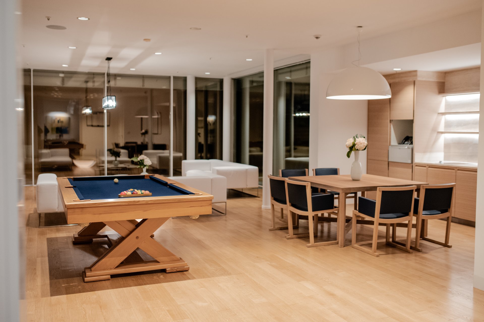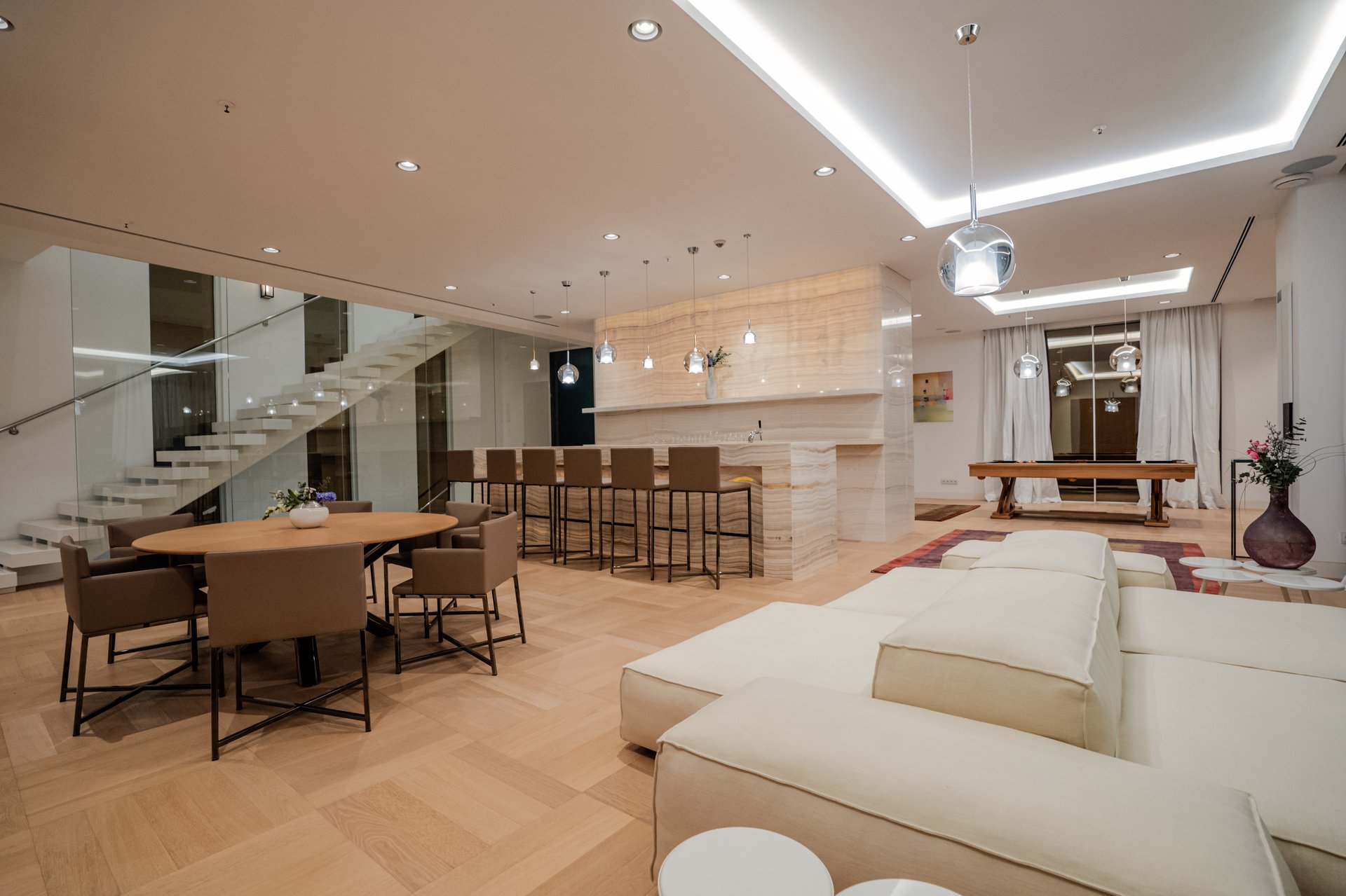 Beyond the accommodations, Villa Katino offers an exceptional range of wellness and leisure experiences. Guests have access to three swimming pools (two outdoors and one indoor) ranging from 8 to 25 meters in length and equipped with features like counter-current jets, cascading waterfalls, and underwater massage systems. The estate also includes two saunas, steam rooms, and spa-style showers for total relaxation, as well as a 100 m² professional gym outfitted with the latest TechnoGym equipment. A private massage room and in-house salon are available for personalized wellness and beauty treatments.