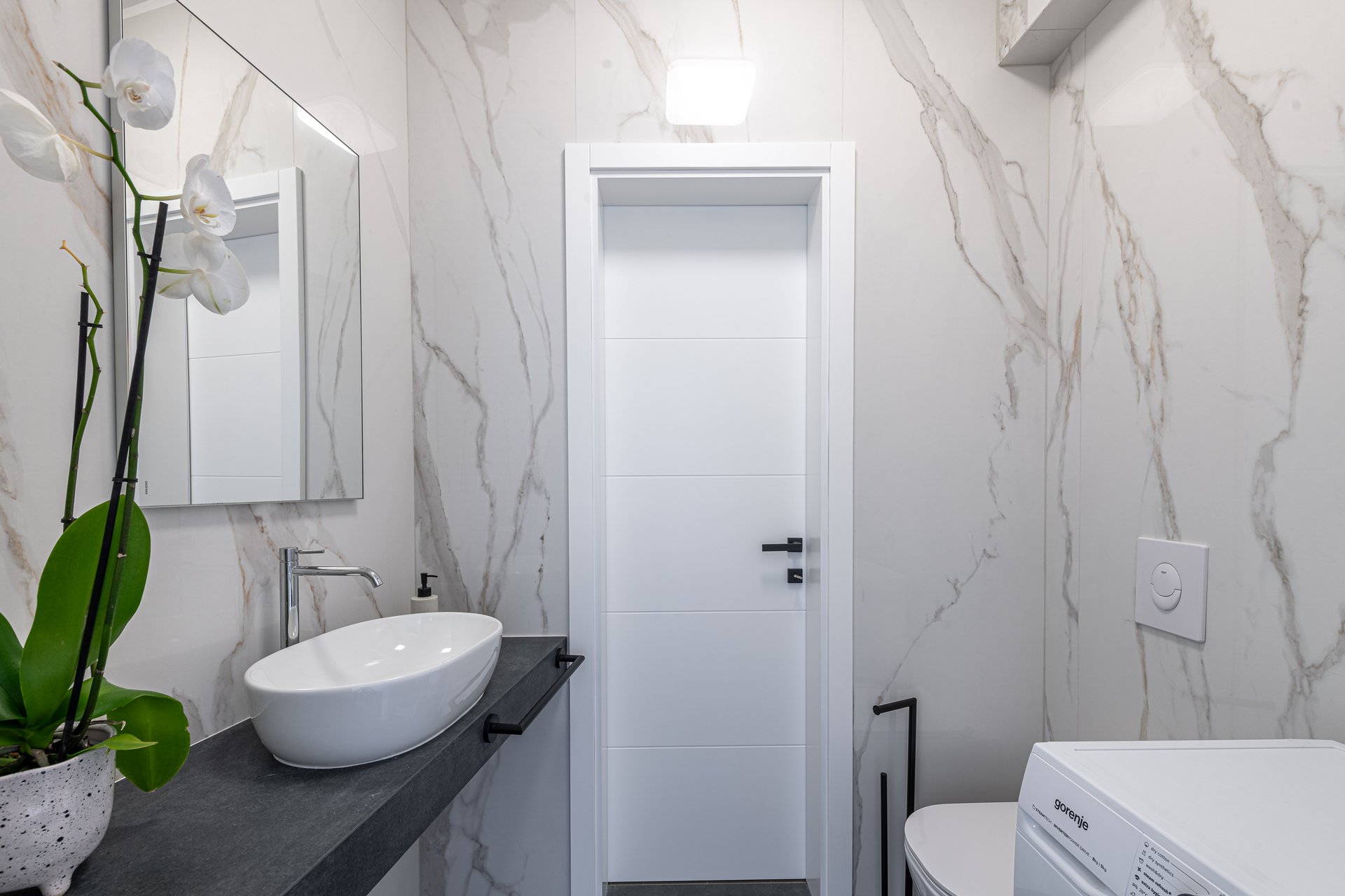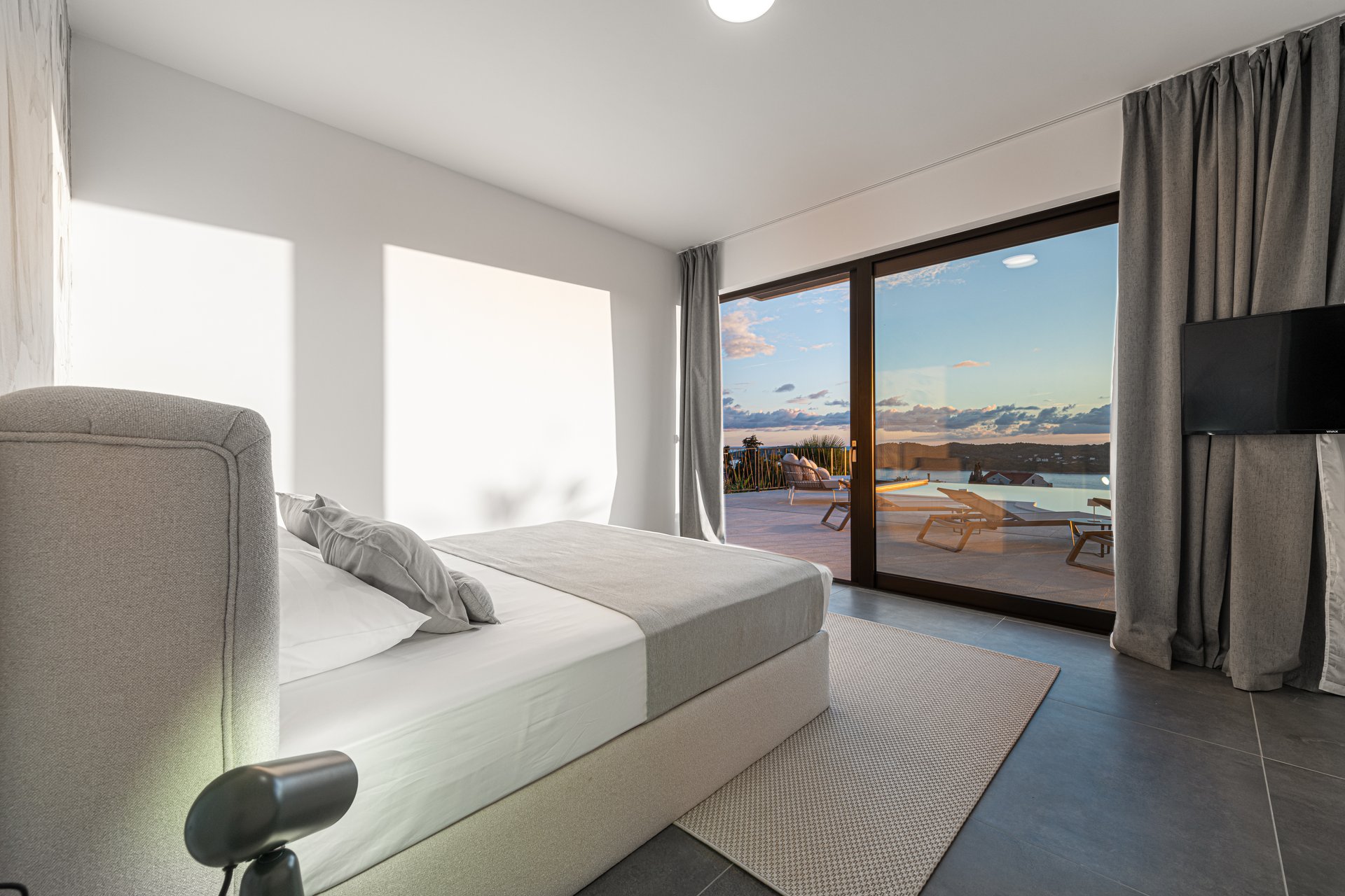 Set on an expansive 800 m² plot, with 290 m² of refined interior space, Villa NAVORA comfortably accommodates up to 10 guests. The villa is elegantly distributed across two floors, featuring five spacious bedrooms—one located on the ground floor, and four on the upper level. Each bedroom is designed with premium comfort in mind and furnished with a king-size bed (over 180 cm). One of the rooms also offers the flexibility to convert the bed into twin beds upon request.