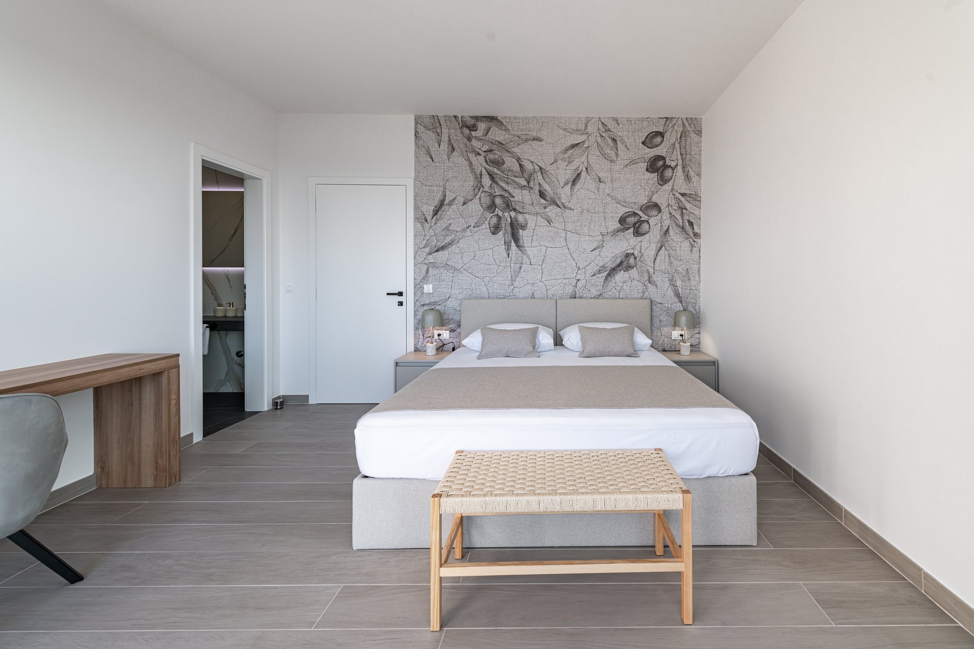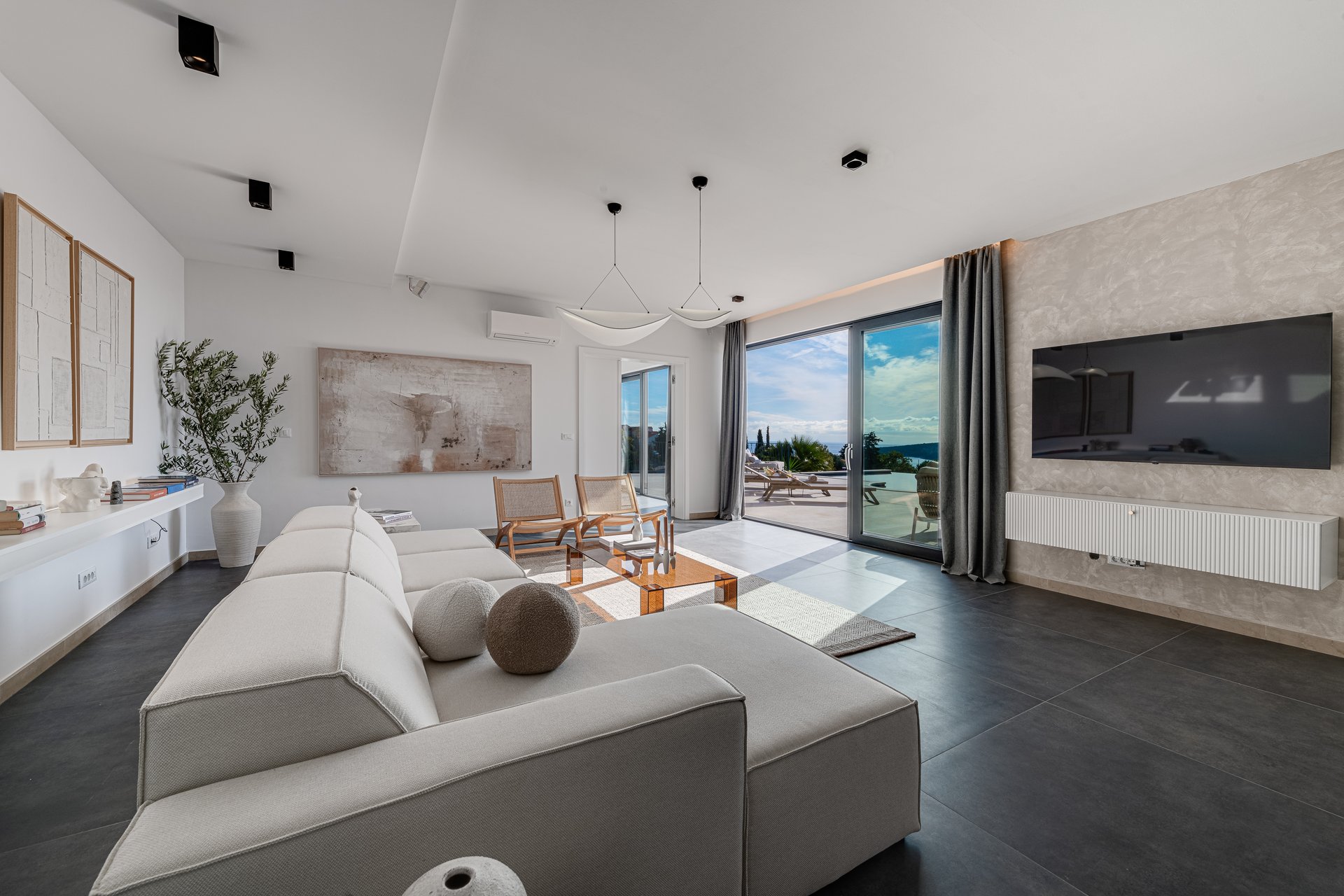 The bedrooms are enhanced with sea-view balconies, with the exception of the ground-floor suite, which features its own private terrace. For added comfort, all rooms are equipped with air conditioning and Wi-Fi, while four bedrooms also include flat-screen TVs for entertainment.