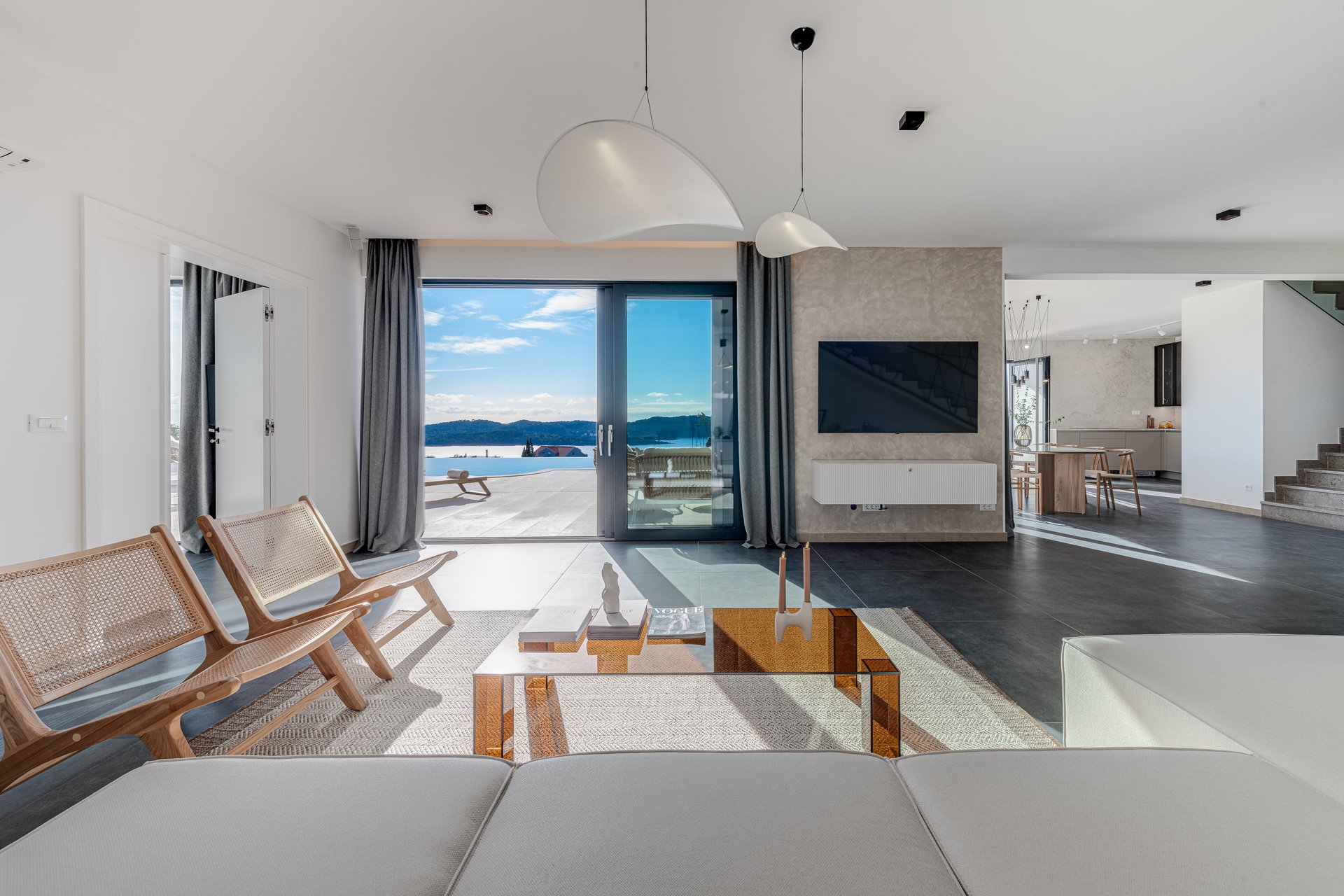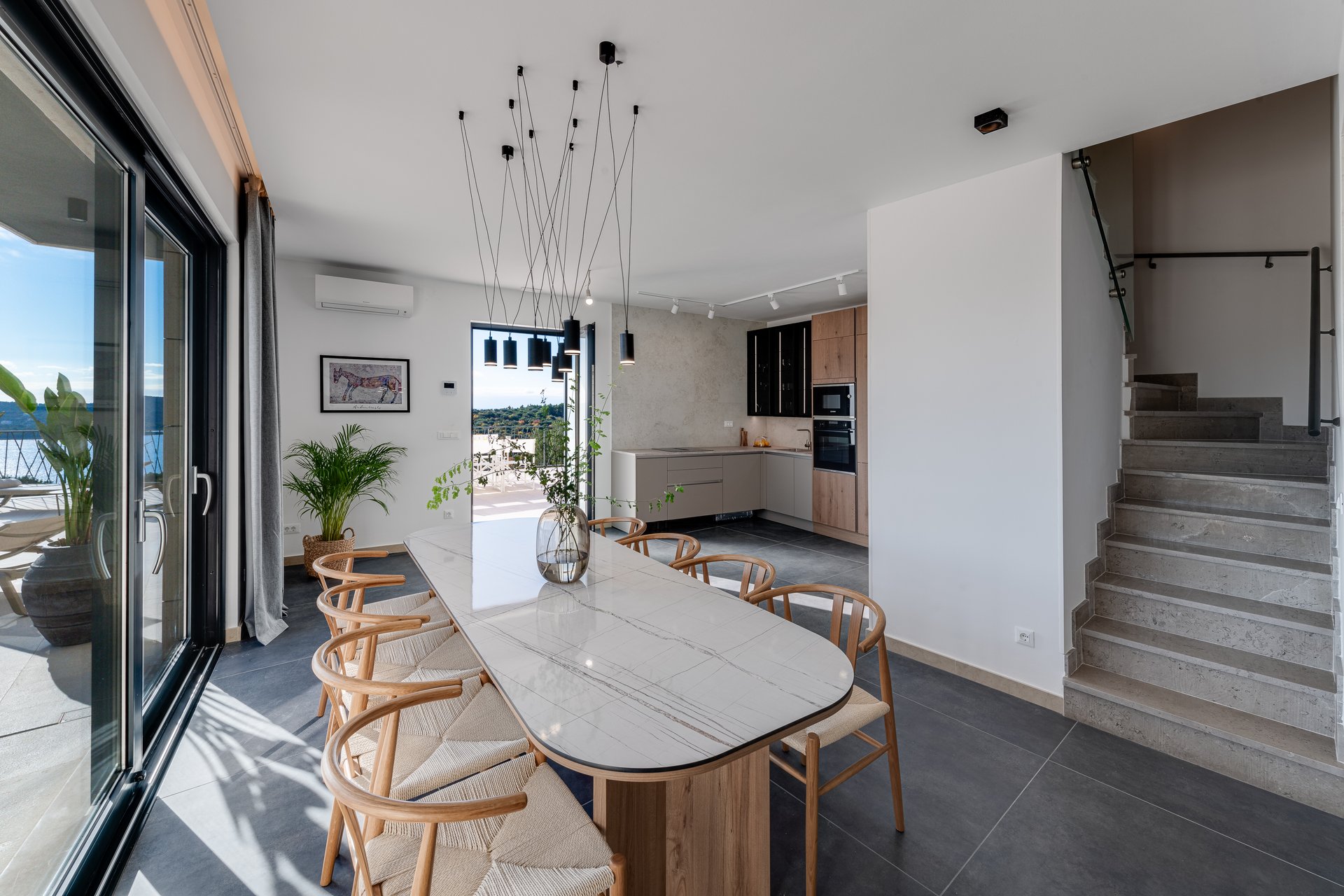 Set on an expansive 800 m² plot, with 290 m² of refined interior space, Villa NAVORA comfortably accommodates up to 10 guests. The villa is elegantly distributed across two floors, featuring five spacious bedrooms—one located on the ground floor, and four on the upper level. Each bedroom is designed with premium comfort in mind and furnished with a king-size bed (over 180 cm). One of the rooms also offers the flexibility to convert the bed into twin beds upon request.